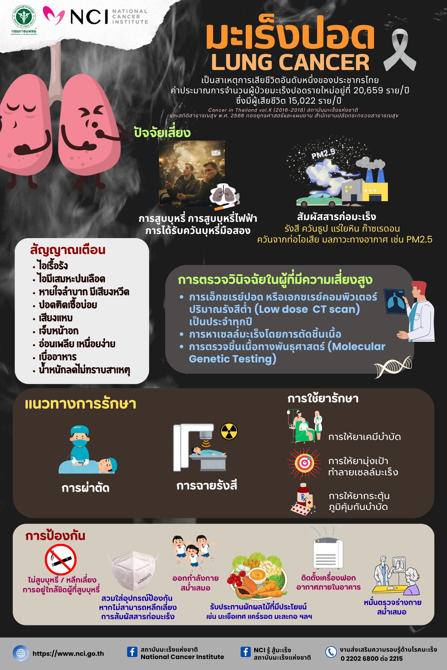 | หากท่านมีข้อสงสัยหรือต้องการหาความรู้ศึกษาข้อมูลเพิ่มเติมได้จากสถาบันมะเร็งแห่งชาติ ผ่านทาง Facebook : สถาบันมะเร็งแห่งชาติ National Cancer Institute และ Line : NCI รู้สู้มะเร็ง |