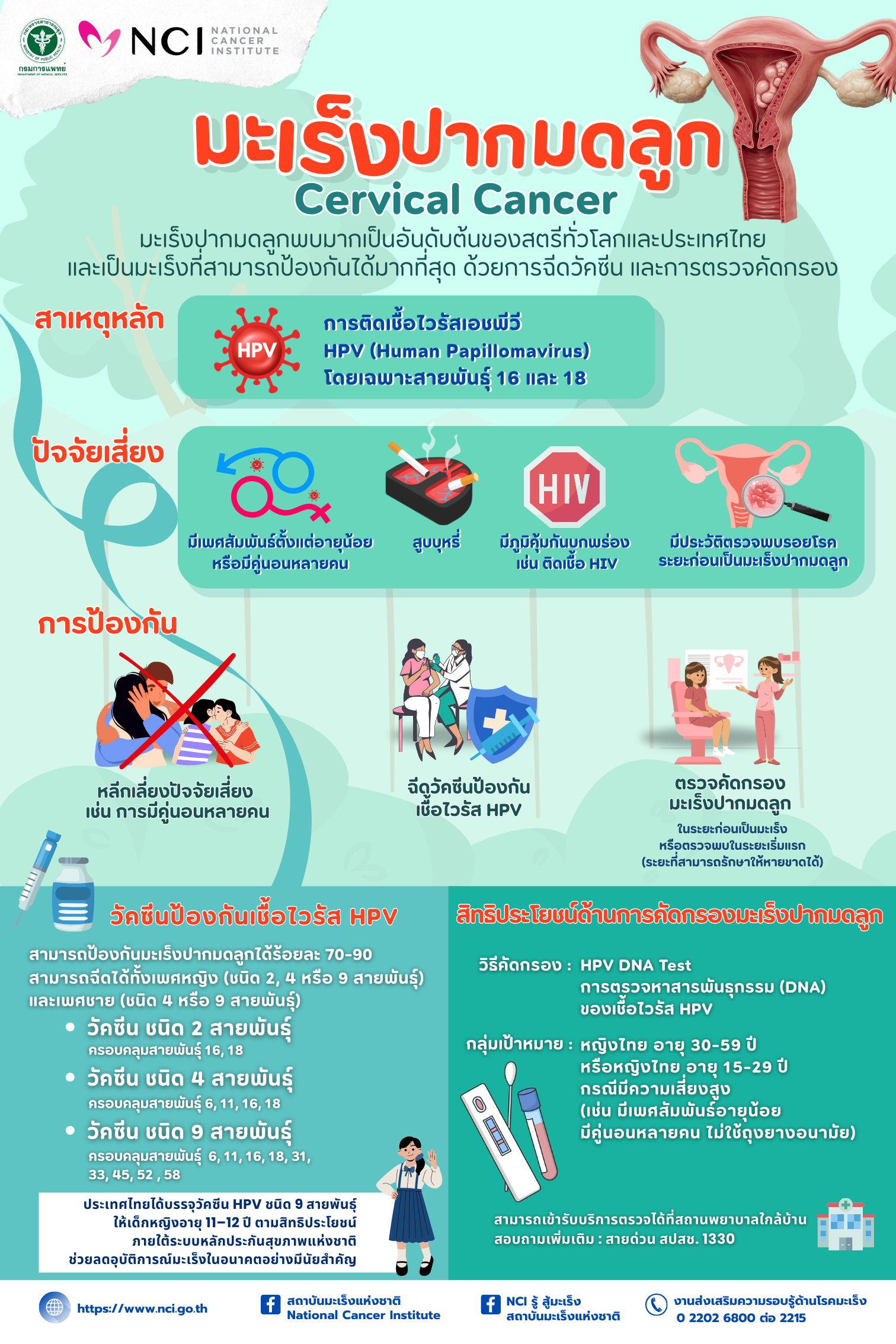 | สาเหตุและปัจจัยเสี่ยง มากกว่าร้อยละ 90 ของผู้ป่วยมะเร็งปากมดลูกเกิดจากการติดเชื้อ Human Papillomavirus (HPV) โดยเฉพาะสายพันธุ์ 16 และ18 ซึ่งเป็นกลุ่มที่มีความเสี่ยงสูง (High-Risk HPV) ไวรัสชนิดนี้ติดต่อผ่านการ