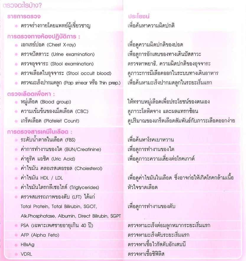 การตรวจประกอบด้วย การตรวจทางห้องปฏิบัติการ ได้แก่ การตรวจเลือด การตรวจอุจจาระ-ปัสสาวะ การตรวจด้วย X-ray ปอด การตรวจคลื่นหัวใจไฟฟ้า การตรวจเซลล์มะเร็งปากมดลูก การตรวจร่างกายโดยแพทย์ และการซักประวัติ |